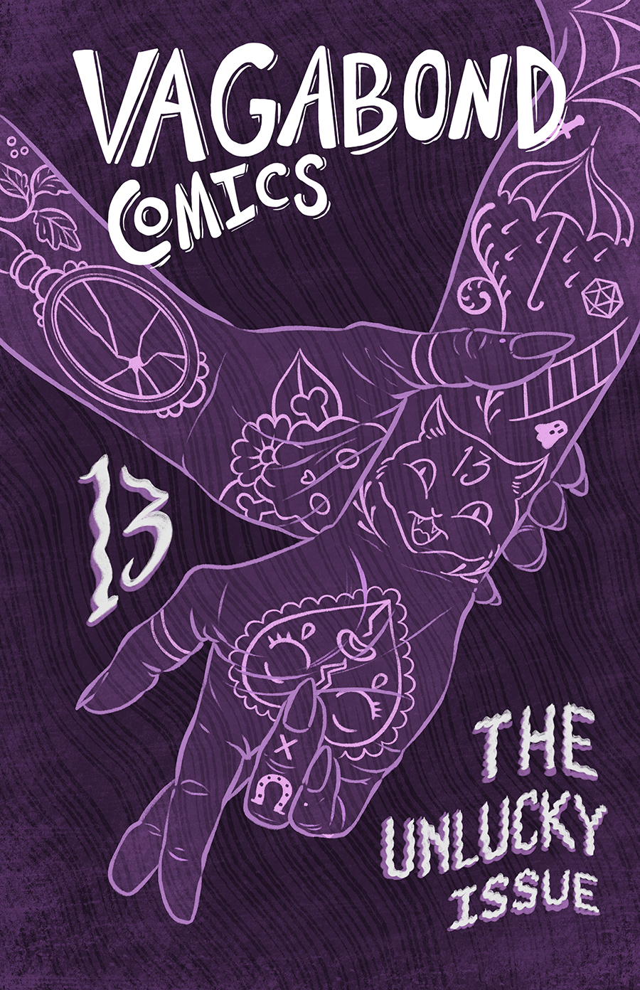 Issue 13 of Vagabond Comics, the Unlucky Issue! Features nineteen comics about bad luck, weird luck, and the circumstances and things that manifest it.